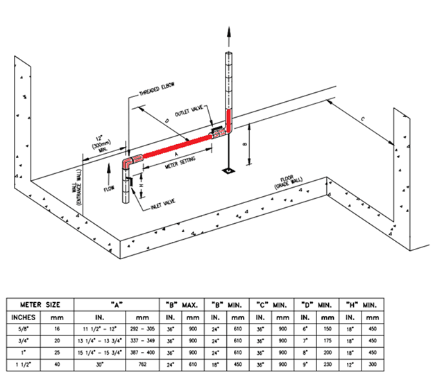 The following water meter standards have been in place since March 2019. WM005 was removed in March 2025. Review the schematics below.