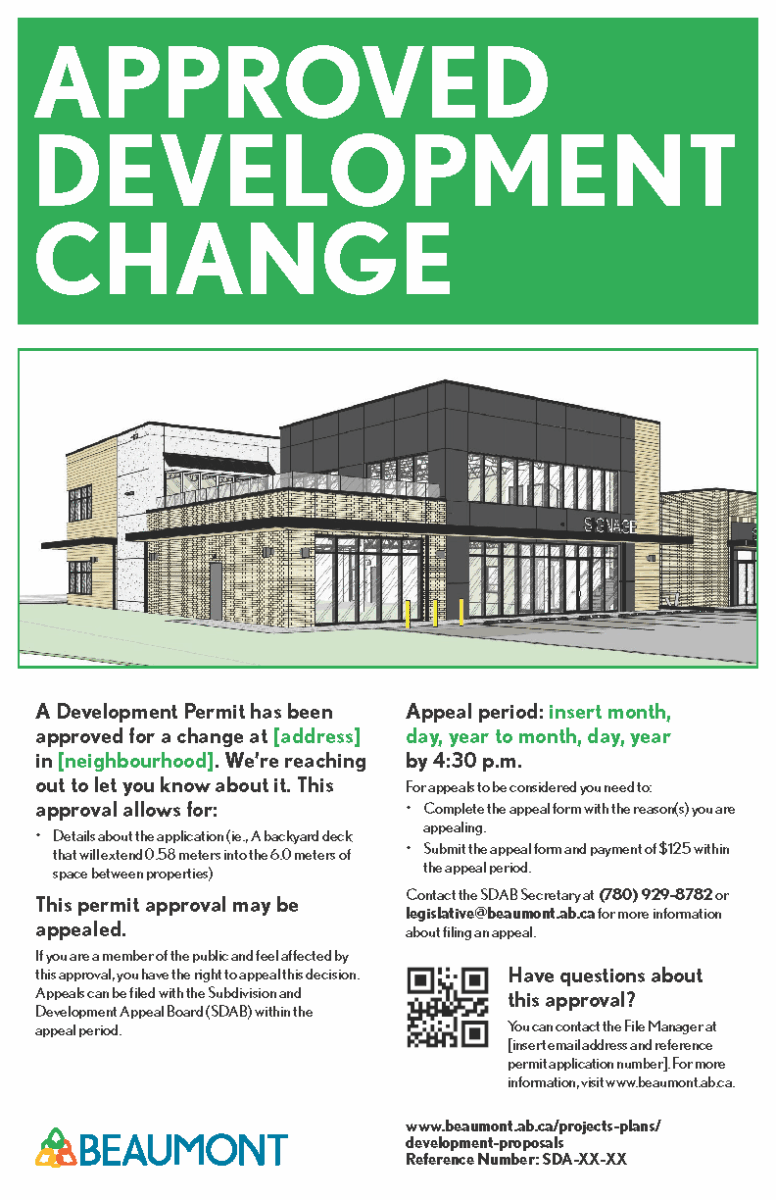 People or businesses applying for a development permit are required to post a sign on the related property for some kinds of applications. These signs tell people in the community what’s being proposed or approved, what the new development could look like and how to get involved or get more information.