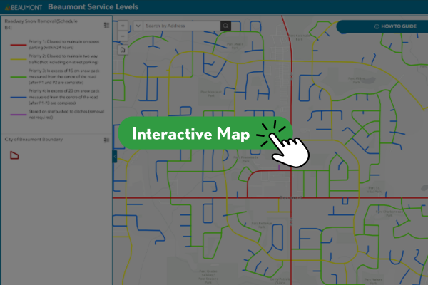 City staff monitor the forecast and will start plowing and sanding at any time, 24 hours a day, when snow has accumulated to 5 cm, or when excessive drifting starts. Streets are cleared based on a priority system so the highest traffic roadways are addressed first. The first priority is the arterial roads in Beaumont along with the other major roadways.