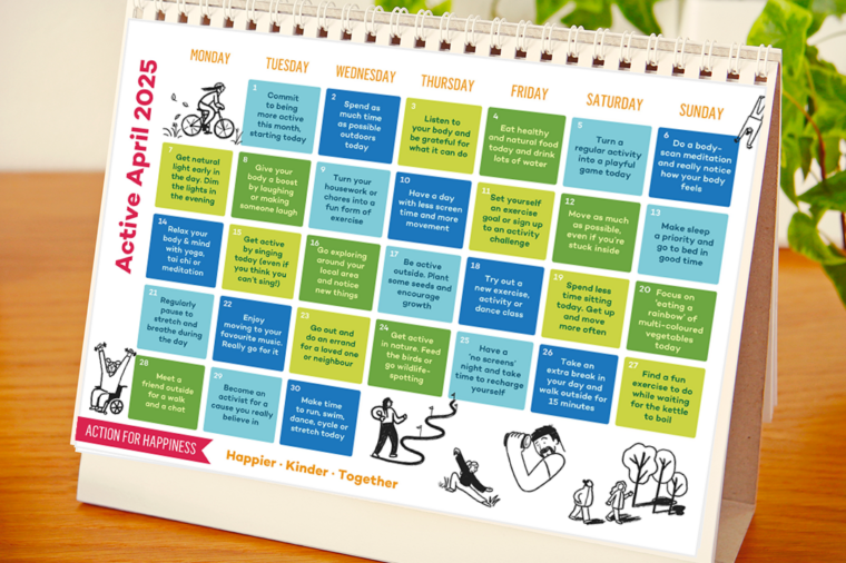 Family & Community Support ServicesAction for Happiness Active April: Action for Happiness The Action for Happiness theme this month is Active April, helping us to take better care of our bodies.