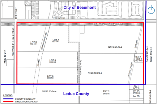 The City of Beaumont is developing plans for an Innovation Park on the land south of Highway 625, between Highway 814 and Range Road 241. The Area Structure Plan (ASP) was approved on February 25, 2025 and guides how the land will be used and serviced by utilities, including the transportation network. The plan area lands are designated for a future local employment area in Our Complete Community: Municipal Development Plan (MDP).