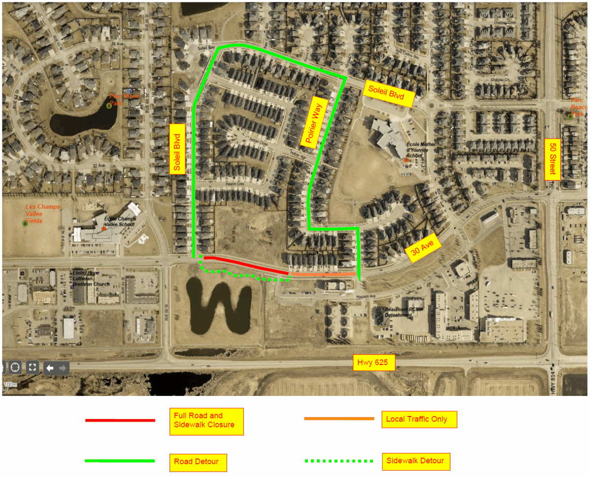 Active Commuting updatesConstruction updatesRoad closures Update (October 17, 2025) 30 Avenue is now open to vehicles. However, the north sidewalk will remain closed until approximately November 15, 2025, weather permitting, while crews complete remaining construction work. Please use caution in the area and follow posted signage for your safety. Update (September 25, 2026) The construction schedule has changed. The closure of 30 Avenue between 50 Street and Soleil Boulevard will now take place from October 1-14, 2025. A section of 30 Avenue between 50 Street and Soleil Boulevard will be closed to vehicles and pedestrians from September 29 to October 11, 2025, to support construction. The closure is expected to last about 13 days, weather and other factors permitting. This closure is needed to install important underground infrastructure, including water and sanitary services, to support new development in Place Chaleureuse. During the closure: Pedestrian access will remain open using the adjacent paved trail, with a short gravel section added to connect around the closure. Detour routes for vehicles will be available and clearly signed on surrounding roads. Local access to adjacent properties will be maintained where possible. Please follow posted signs, allow extra travel time, and use caution near the construction area. A detailed map showing closure limits, the temporary pedestrian trail, and vehicle detour routes is included. Your patience and care as you move through the area during construction is appreciated.