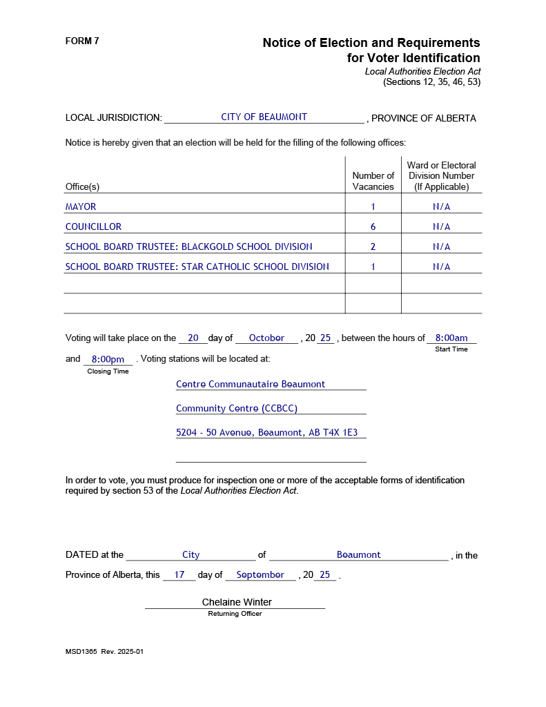 City update Election day will be held on October 20, 2025. Four (4) advance voting dates will also be held to provide electors with a greater opportunity to cast their vote. Electors are encouraged to vote at any one of the dates listed below, at the Centre Communautaire Beaumont Community Centre (CCBCC) 5204 – 50 Avenue. Advance voting Monday, October 6 – Noon to 8 pm Tuesday, October 7 – Noon to 8 pm Tuesday, October 14 – Noon to 8 pm Wednesday, October 15 – Noon to 8 pm Election day Monday, October 20, 2025 – 8 am to 8 pm Centre Communautaire Beaumont Community Centre (CCBCC) 5204 – 50 Avenue Voter requirements Every person who attends at a voting station for the purpose of voting must be on the permanent elector list and produce one piece of identification issued by a Canadian government, whether federal, provincial or local, or an agency of that government, that contains a photograph of the person. Those not on the permanent elector list must make a statement that the person is eligible to vote as an elector in the presence of an officer at the voting station, in the prescribed form, and can validate their identity and address of residence with one piece of identification issued by a Canadian government, whether federal, provincial or local, or an agency of that government, that contains a photograph of the person. If you have any questions regarding the upcoming election, please contact Chelaine Winter, Returning Officer at 780‑929‑8782 or email election@beaumont.ab.ca