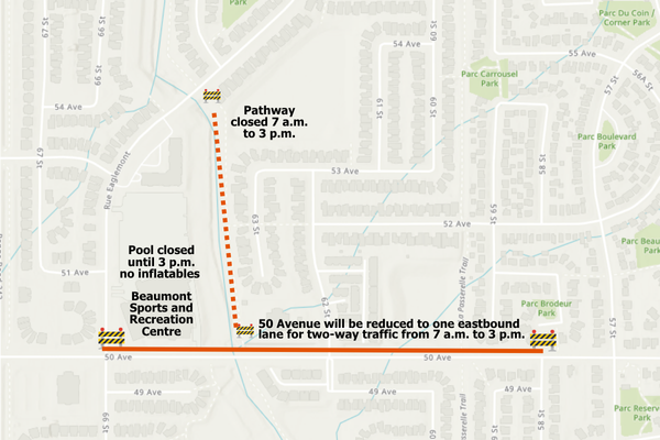 Commuting updatesEvent noticeFacility closuresRoad closures On Saturday, July 19, three temporary closures will be in place to support the safety of participants in Triathlon Alberta’s Race the Prairies event. Here’s what you need to know: The pool at the Beaumont Sport and Recreation Centre (BSRC) will be closed to the public until 3 pm. The inflatable swimming course will not be available that day and will return as scheduled on August 2, 2025. 50 Avenue (Rue Eaglemont to 58 Street) will be reduced to a single eastbound lane for two-way traffic from 7 am to 3 pm and may cause temporary minor delays. The pathway east of BSRC will be closed from 7 am to 3 pm. We recognize these closures may affect your Saturday plans and thank you for your patience and support. Your cooperation helps keep young athletes safe and contributes to a successful event. The City of Beaumont welcomes more than 100 young athletes, their families and volunteers to Beaumont for a day of racing in our community.